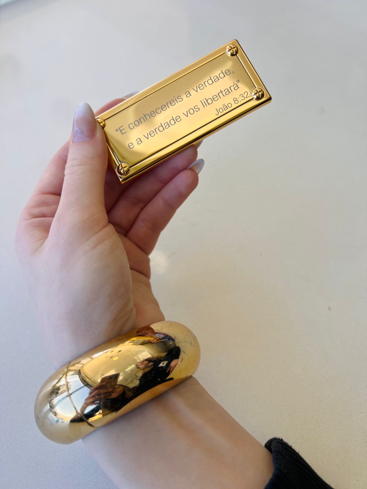 Agora você pode deixar sua Bíblia ainda mais especial com nossa placa personalizada, banhada em dourado e finalizada com verniz italiano. Grave seu nome, o versículo que toca seu coração ou aquela frase que Deus ministrou a você.