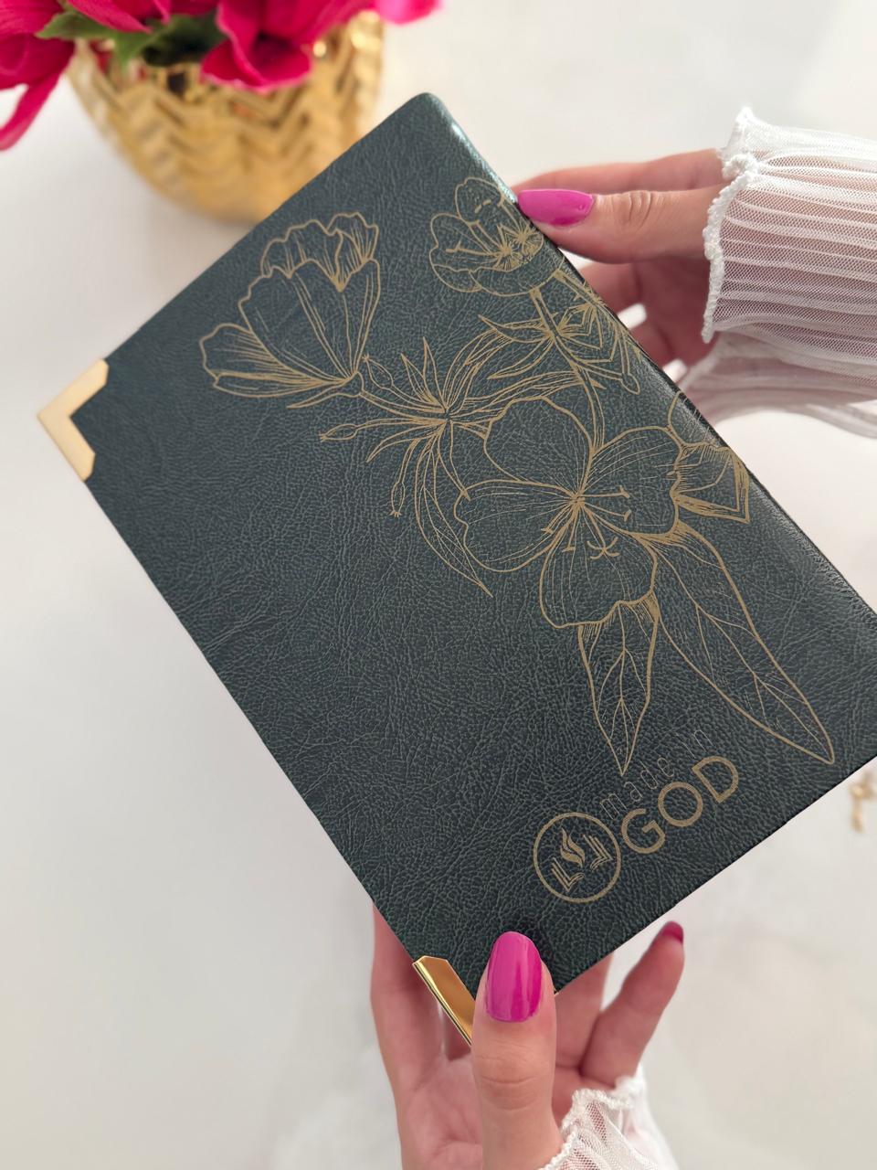 Combo Bíblia com nome courino Oliva Floral + Cartela de índices Dourada+ Placa Média