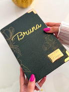 Combo Bíblia com nome courino Oliva Floral com Nome Vazado em Dourado, finalizado com cantoneiras douradas, fitinha de cetim e pingente de Cruz combinando com a bíblia!