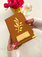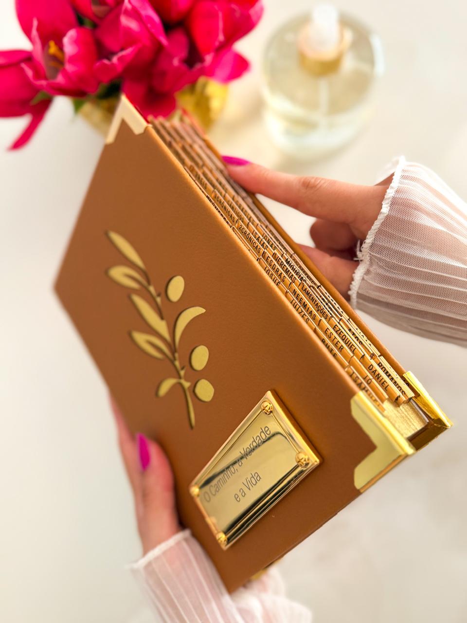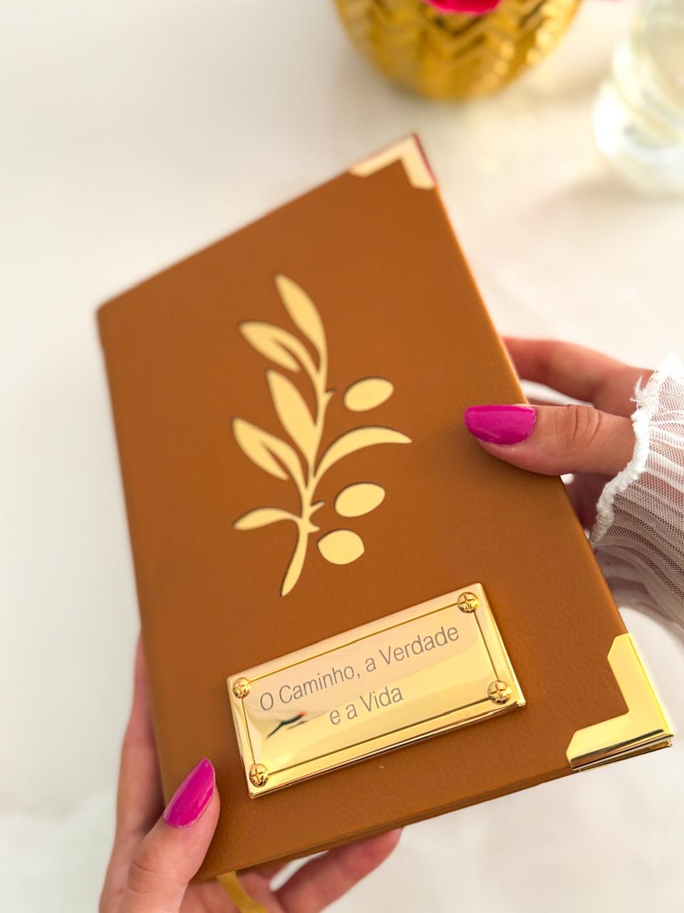 Combo Bíblia personalizada em Courino Caramelo com Oliveira Dourada vazado, finalizado com cantoneiras douradas, fitinha de cetim e pingente de Cruz combinando com a bíblia!