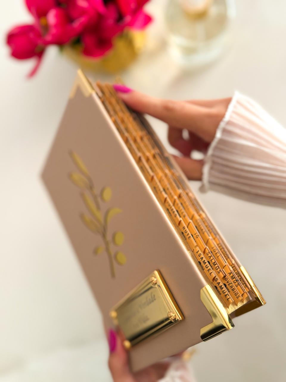Combo Bíblia personalizada em Courino Nude com Oliveira Dourada vazado, finalizado com cantoneiras douradas, fitinha de cetim e pingente de Cruz combinando com a bíblia!