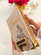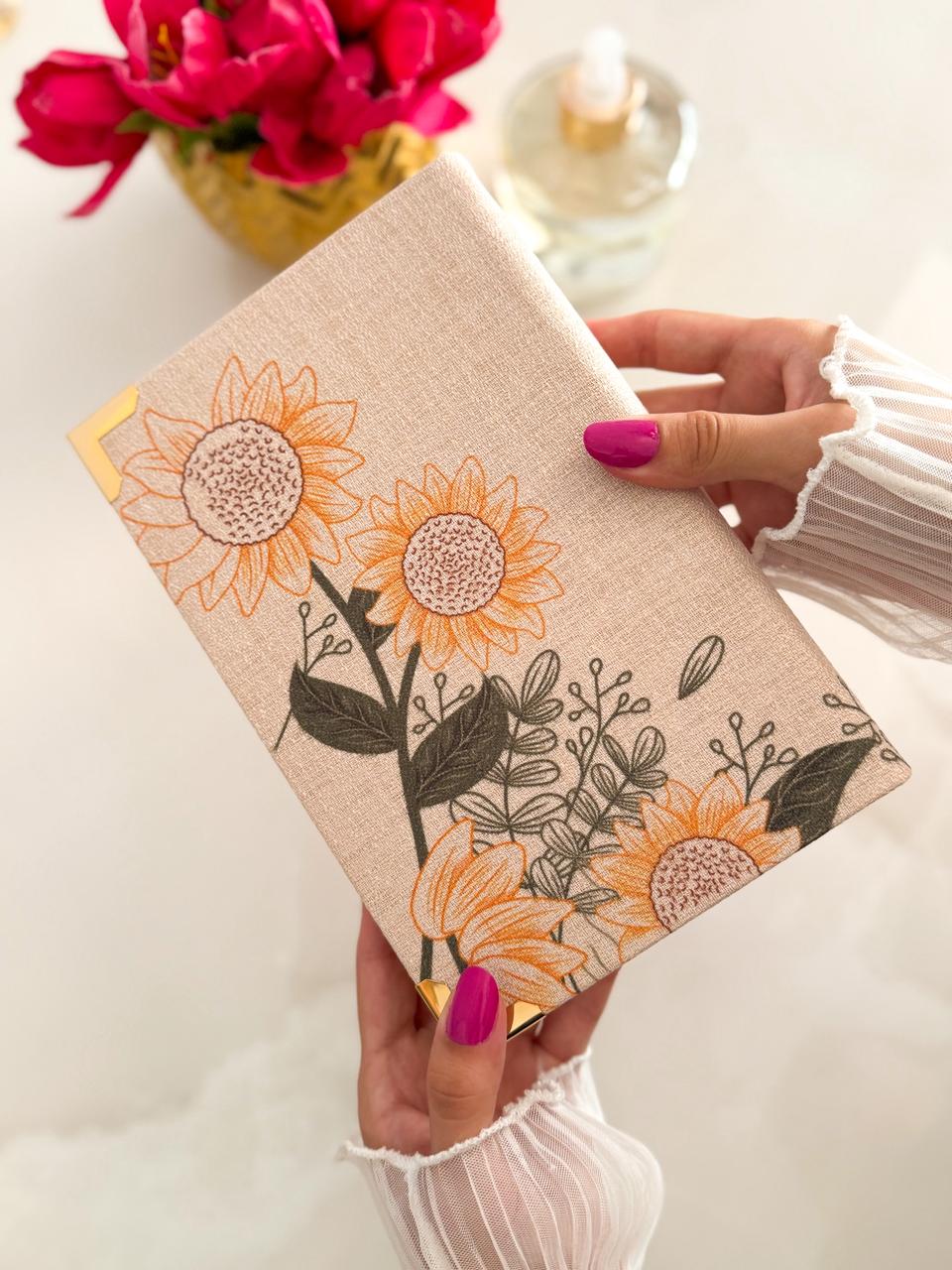 Combo Bíblia em Linho Jardim com nome vazado + Cartela de índices Dourada+ Placa Grande Dourada