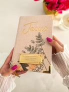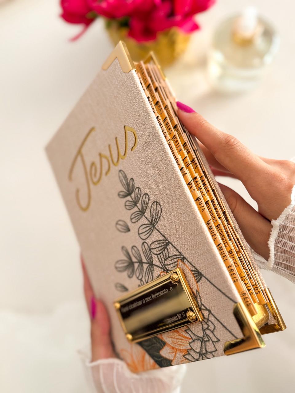 Combo Bíblia em Linho Jardim com nome vazado, finalizado com cantoneiras douradas, fitinha de cetim e pingente de Cruz combinando com a bíblia!