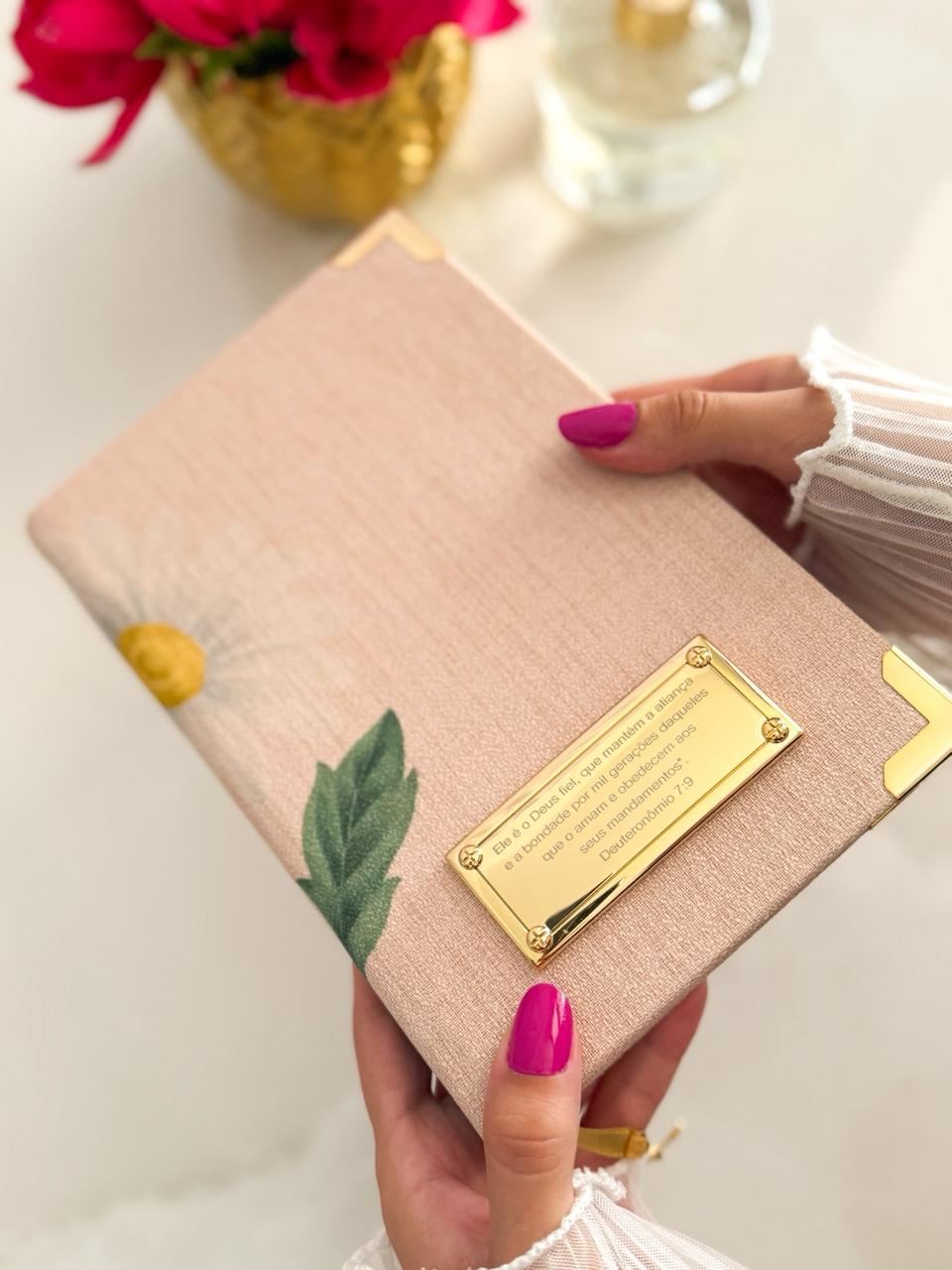 Combo Bíblia em Linho Margaridas + Cartela de índices Dourada+ Placa Grande Dourada