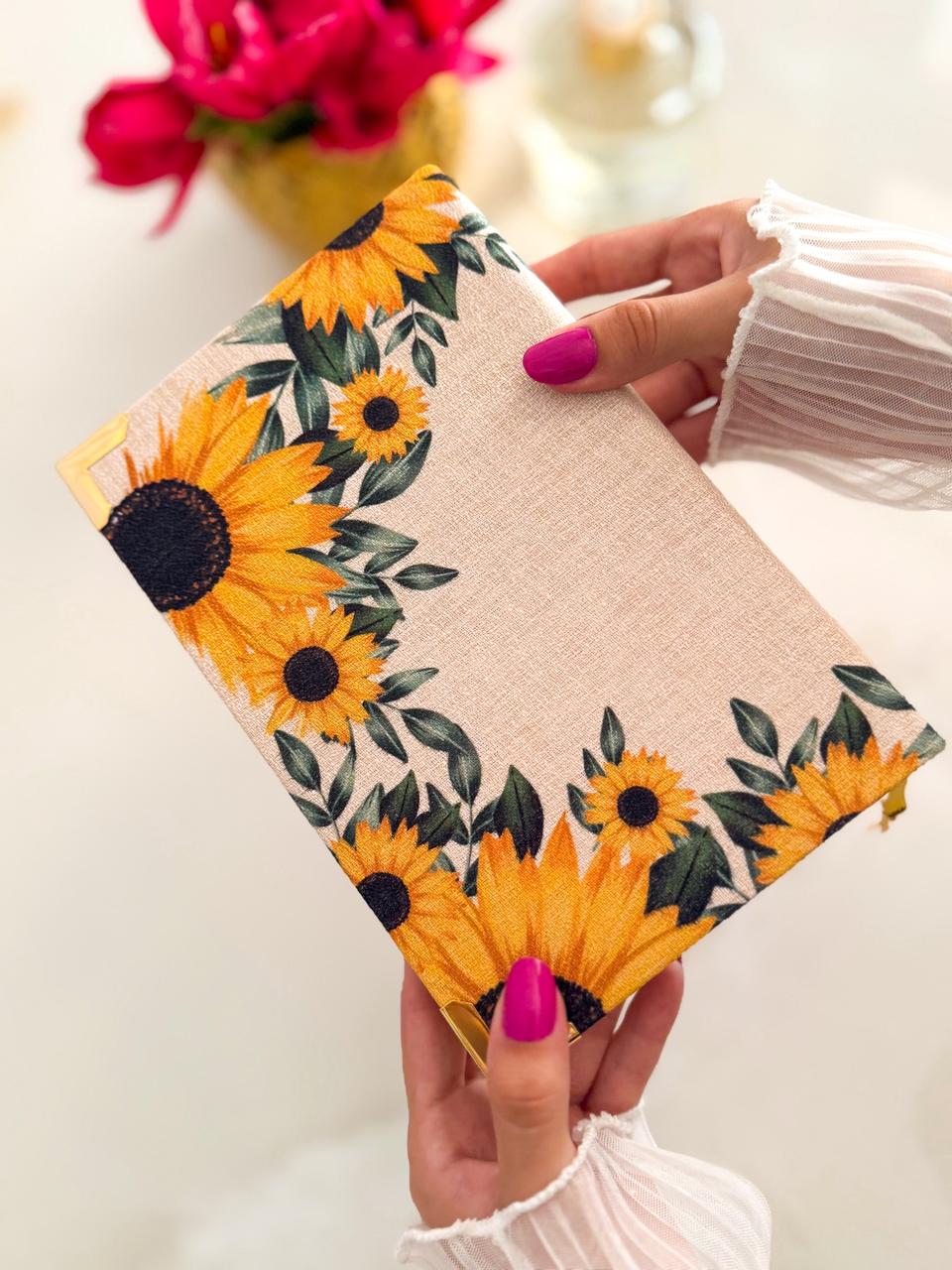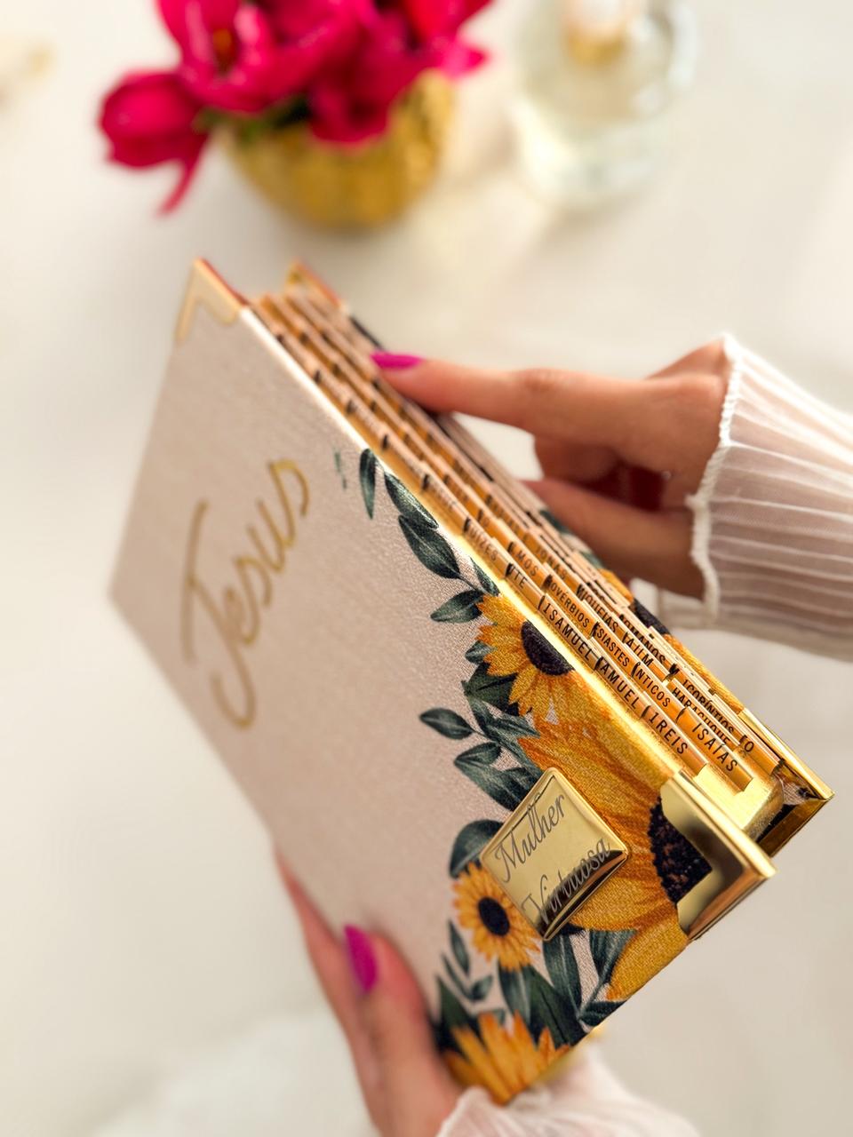 Combo Bíblia em Linho Jardim de Girassol com nome vazado + Cartela de índices Dourada+ Placa Grande Dourada