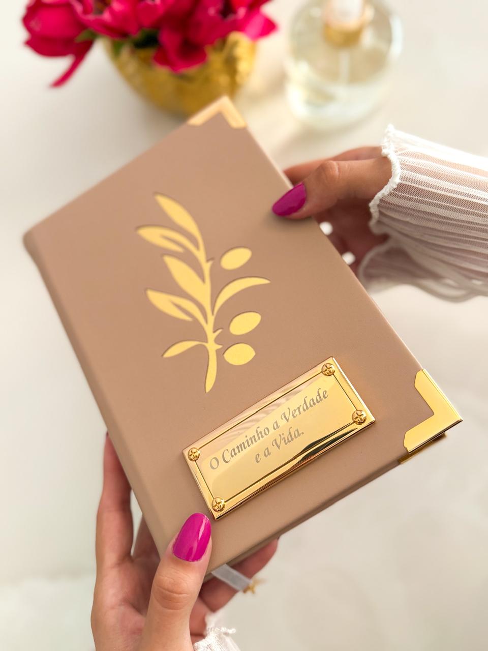 Combo Bíblia Courino Nude com Oliveira Dourada+ Cartela de índices + Placa Grande