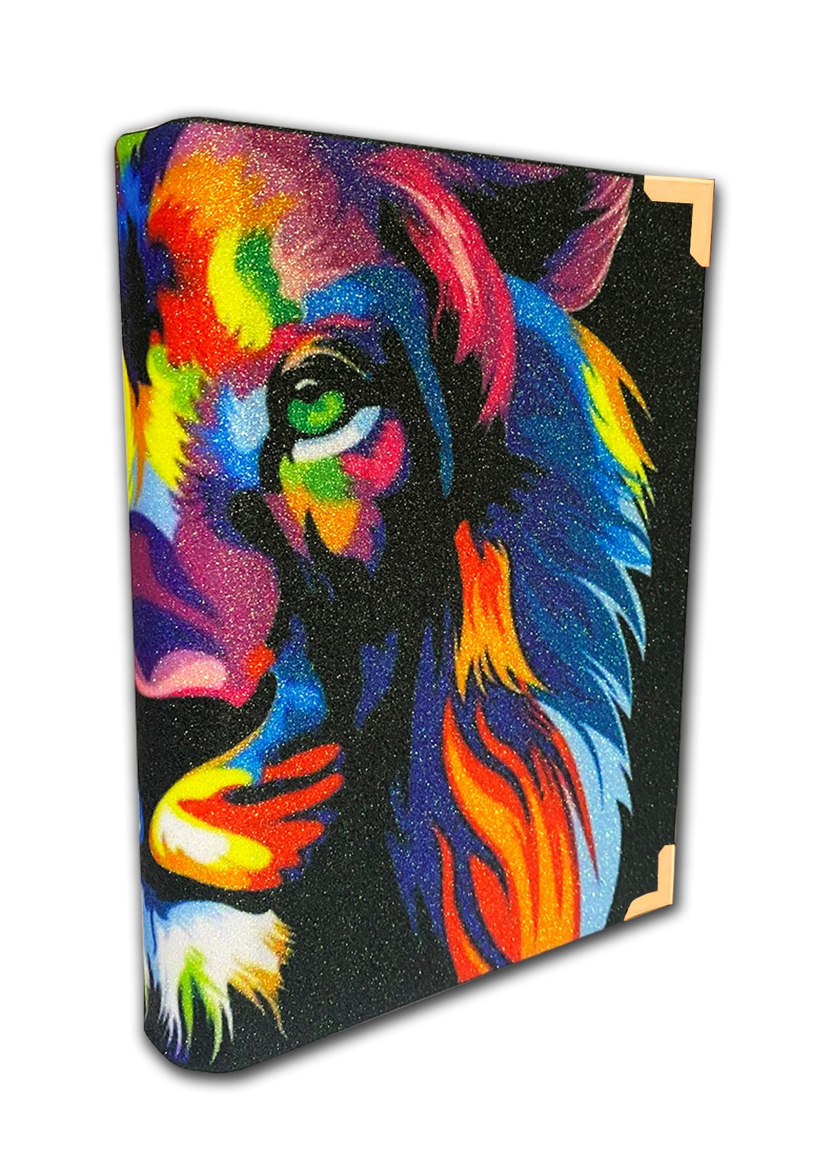 Bíblia personalizada com tecido em glitter leão colorfull, finalizado com cantoneiras banhadas a ouro, fitinha de cetim e pingente de cruz combinando com a bíblia!