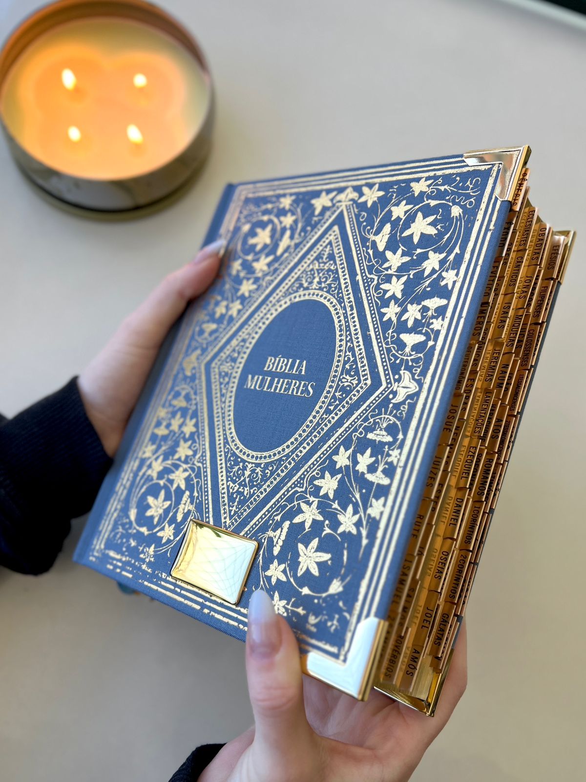 Combo com Bíblia Mulheres NAA Vintage Azul capa dura + Placa pequena dourada + Cartela de índices dourada