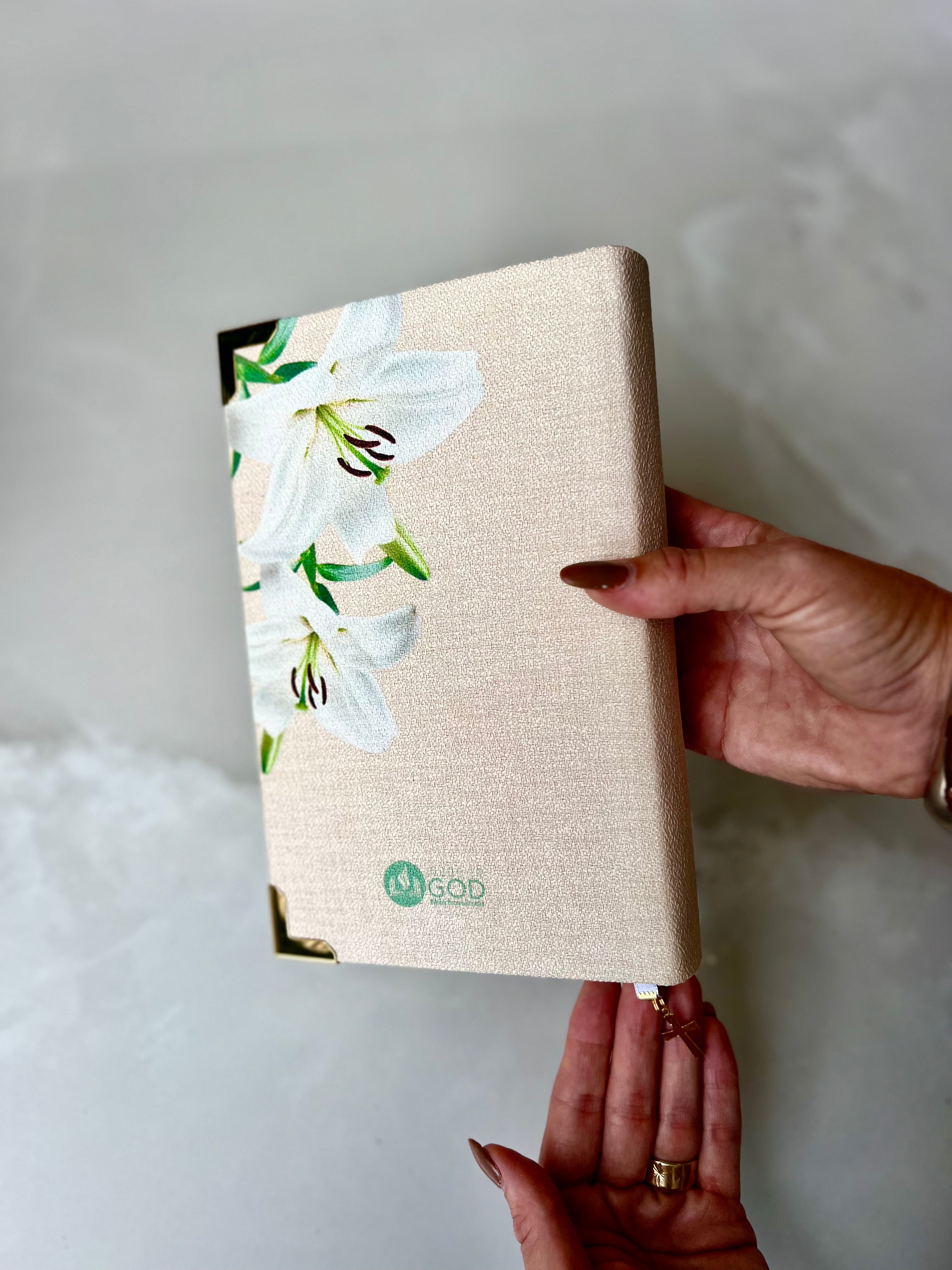 Bíblia em tecido personalizada com nome na frente, composta com Lírio. Finalizada com cantoneiras banhadas douradas e uma fitinha de cetim com pingente de cruz.