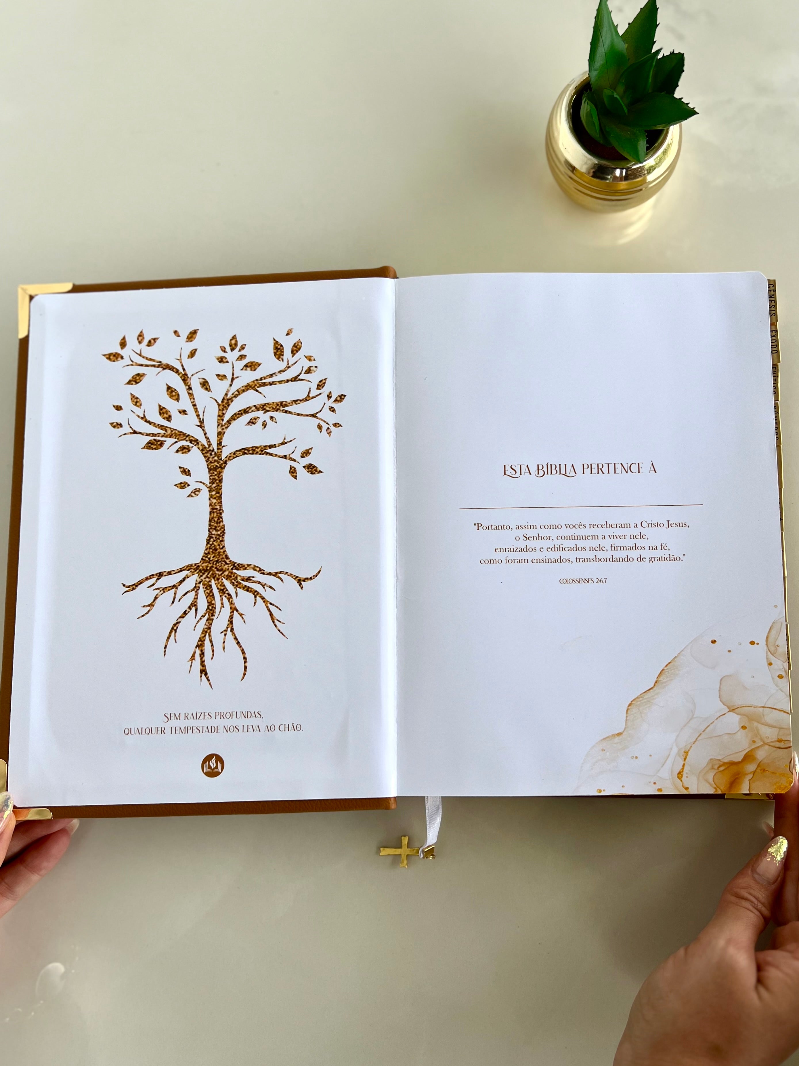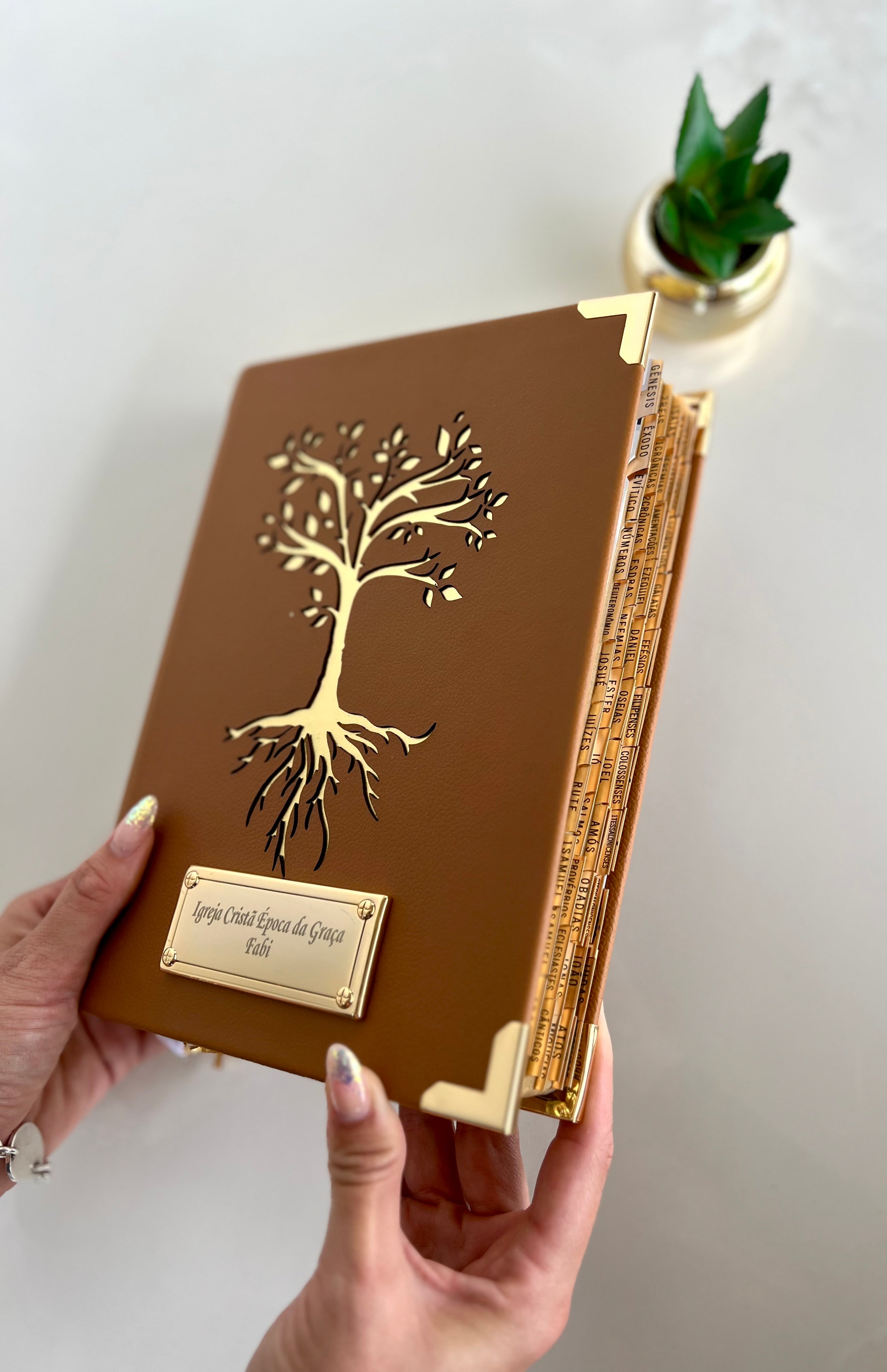 Combo Bíblia Courino Caramelo Arvore da Vida com Cartela de índice e Placa Grande