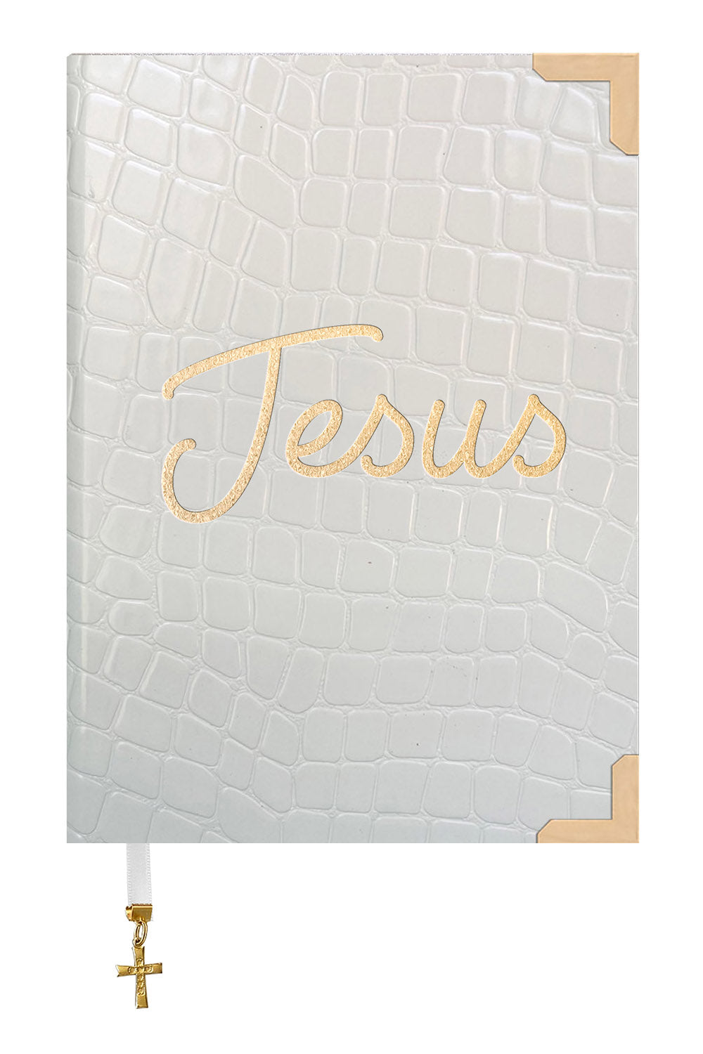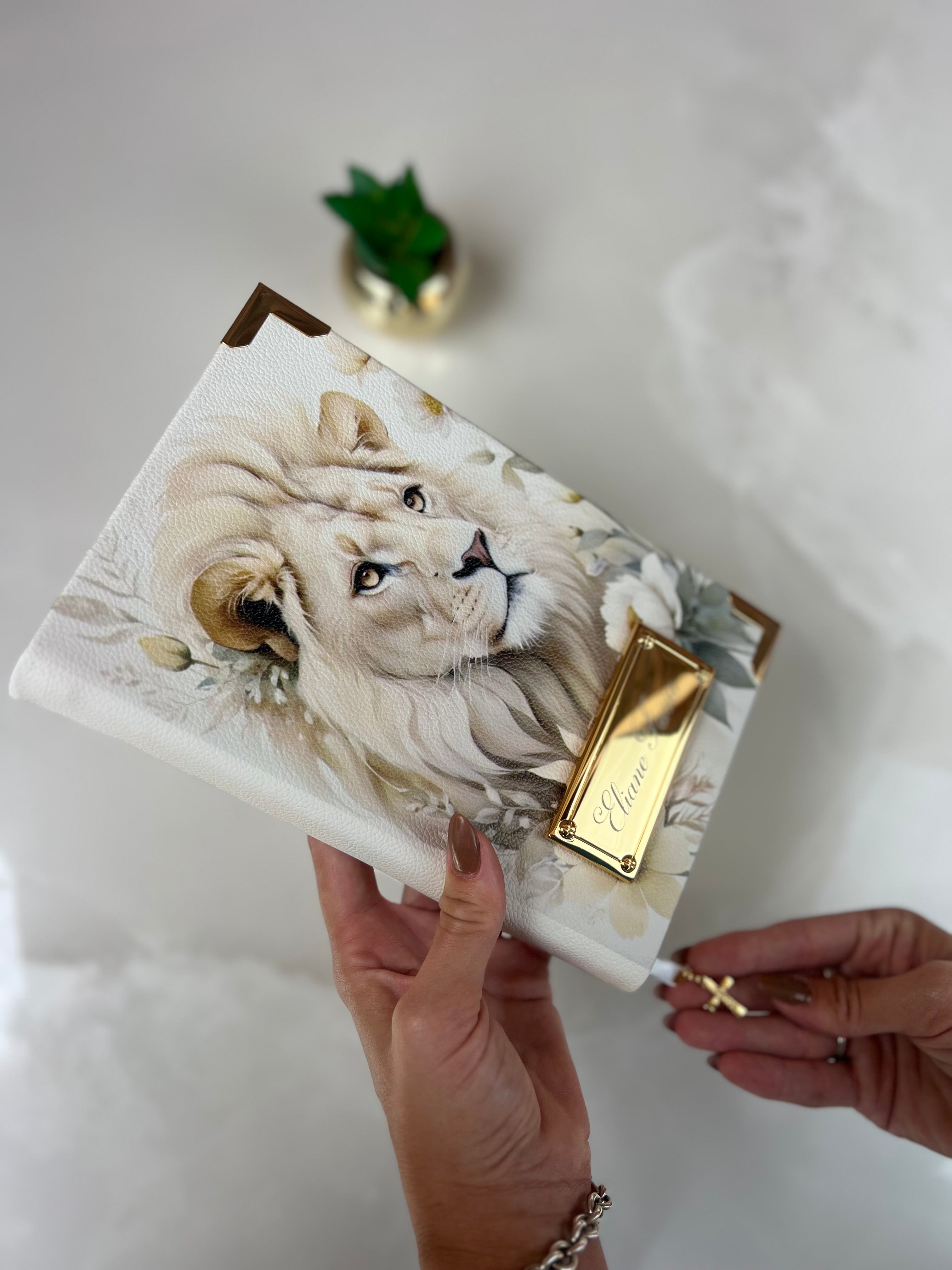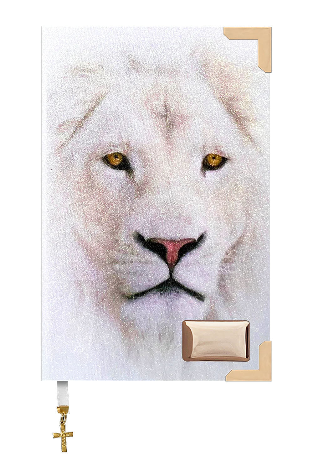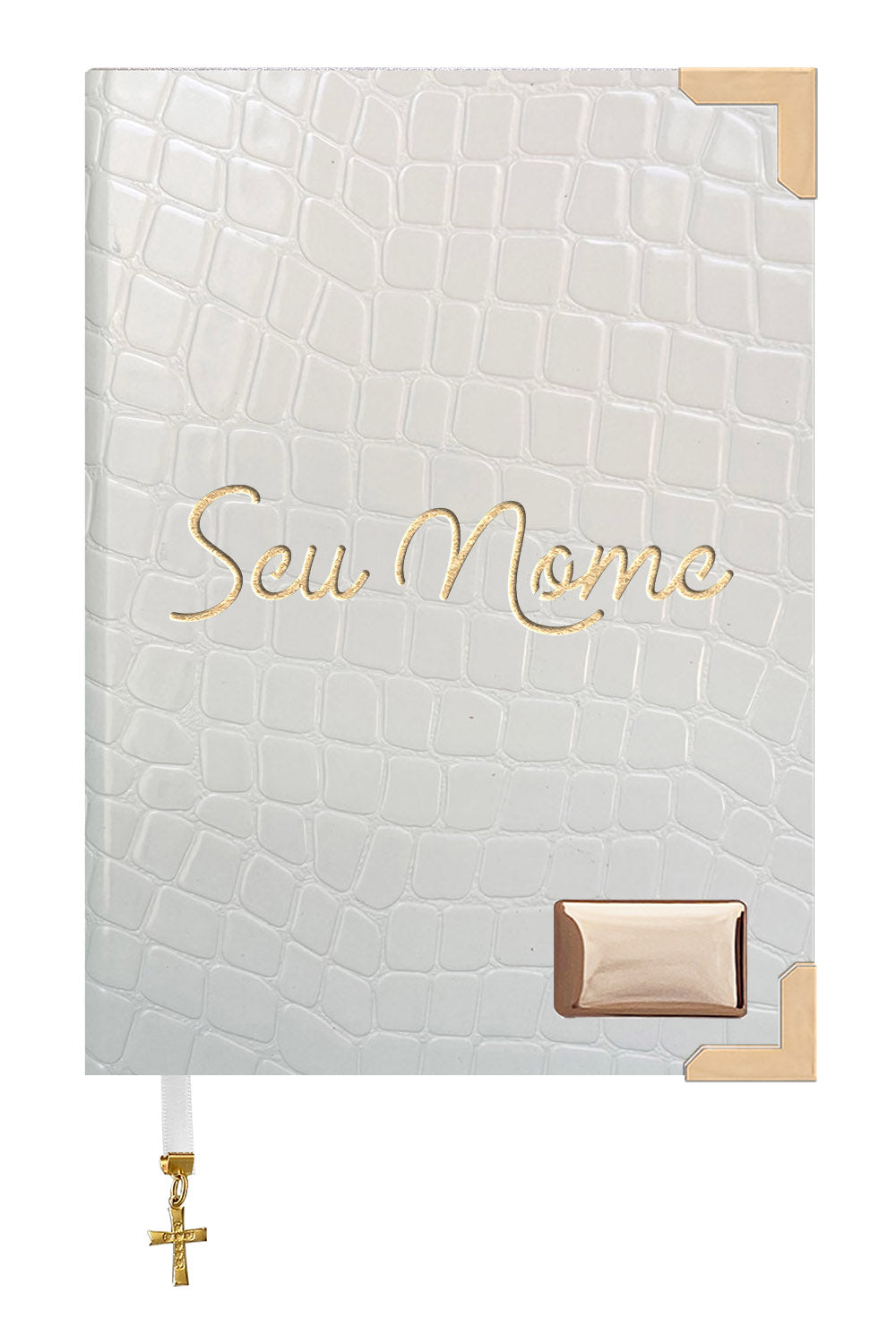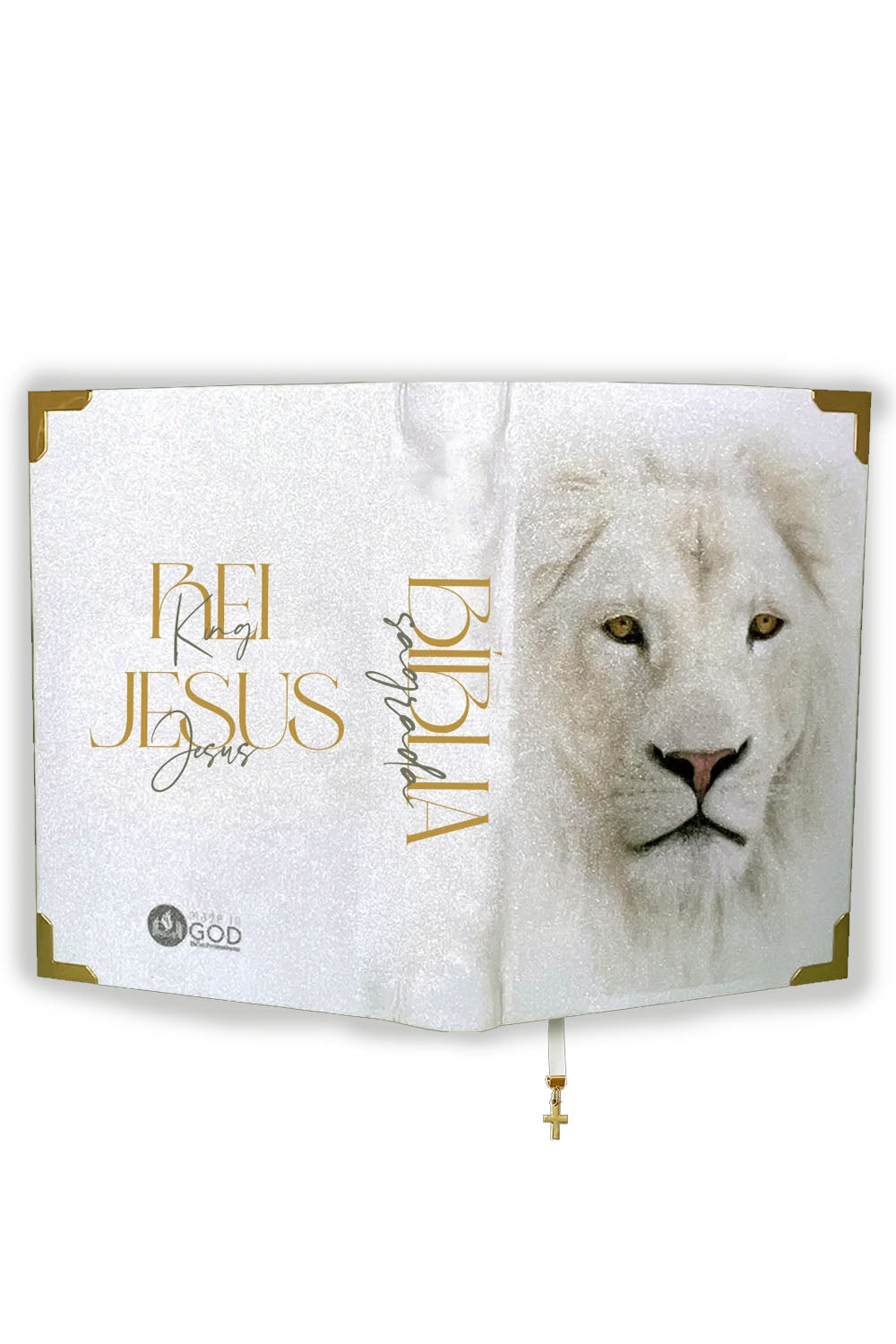 Combo Bíblia Glitter Branco Leão Aslam + Placa Média + Cartela de índices dourada