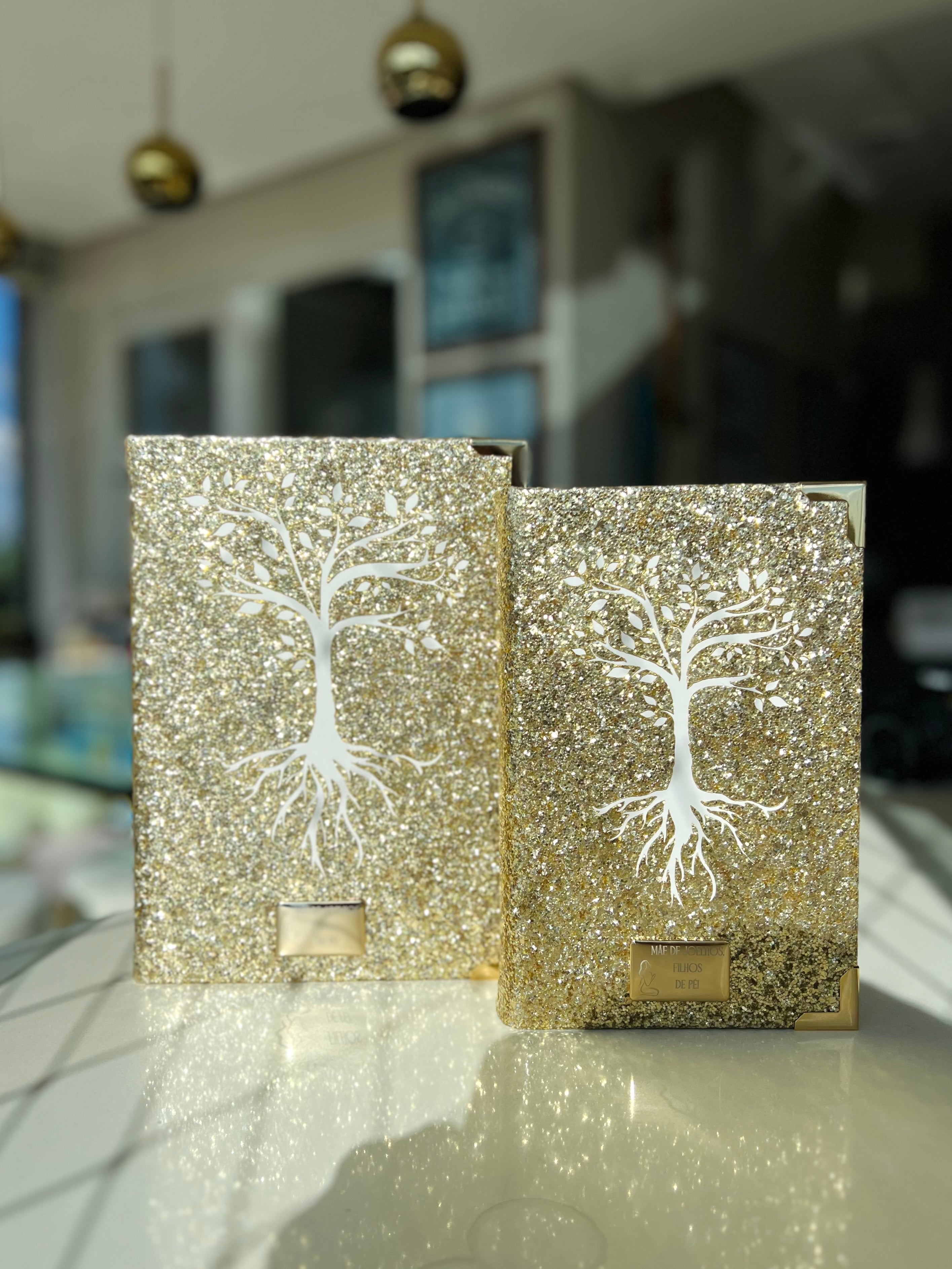 Combo Bíblia Árvore da Vida Glitter Dourado + Placa + Índice