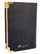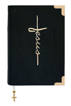 Bíblia personalizada em couro legítimo preto, com arte vazada Jesus na vertical, finalizado com cantoneiras banhadas a ouro, fitinha de cetim e pingente de cruz combinando com a bíblia!