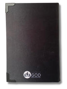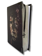 Bíblia em tecido cetim com rosto metade homem e a outra metade leão , finalizada com cantoneiras metalizadas banhadas em preto, com fitinha de cetim e pingente de cruz preta!