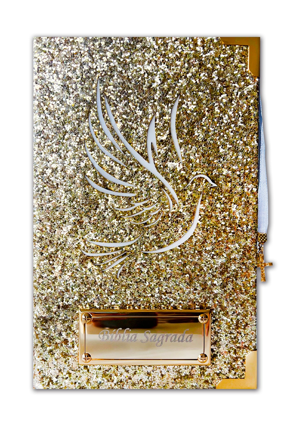 Bíblia média em Glitter Dourado com pombinha do Espírito.