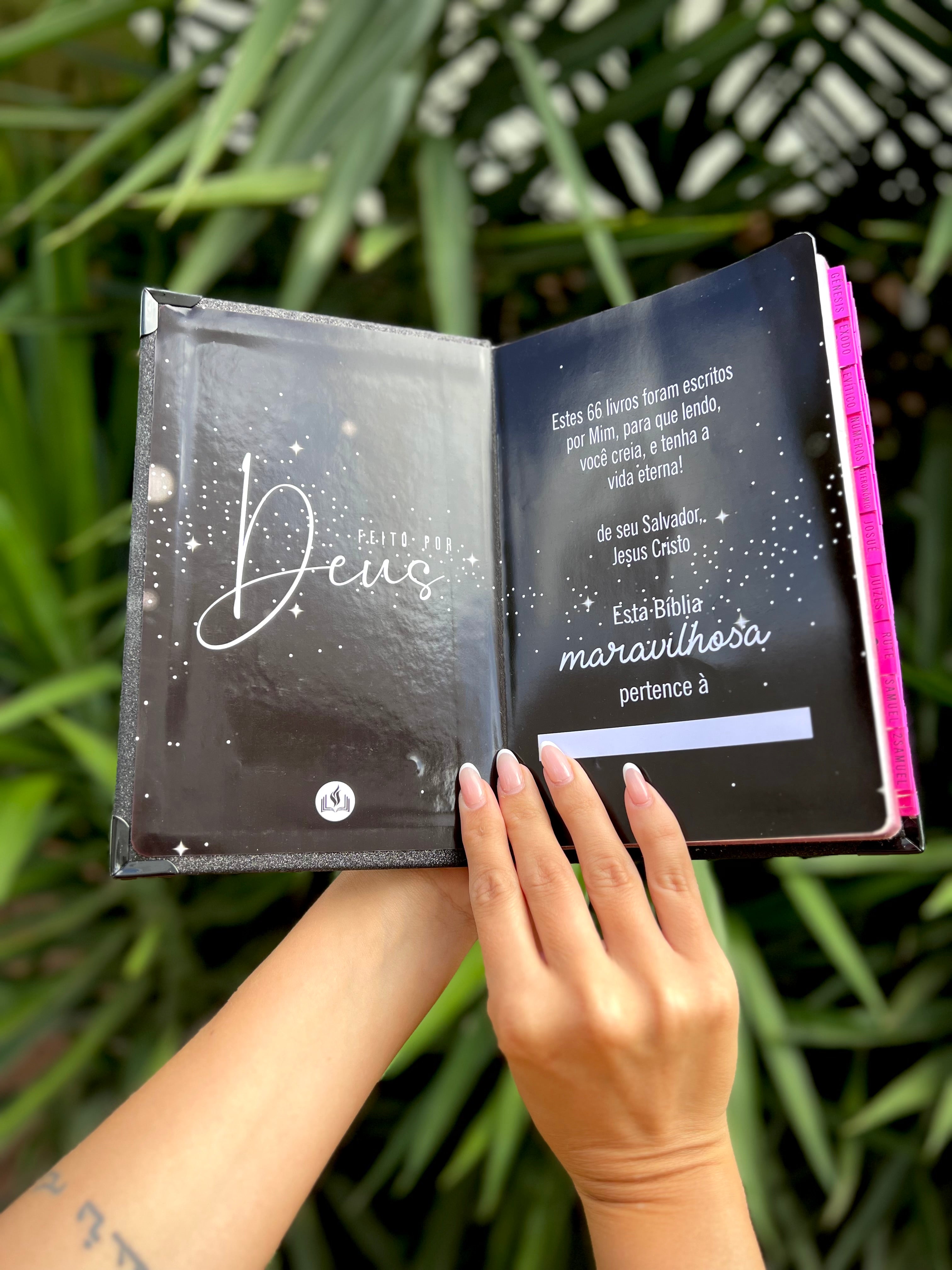 Combo Bíblia média Glitter Mar negro Jesus em rosa + Cartela de índice + Placa Grande.