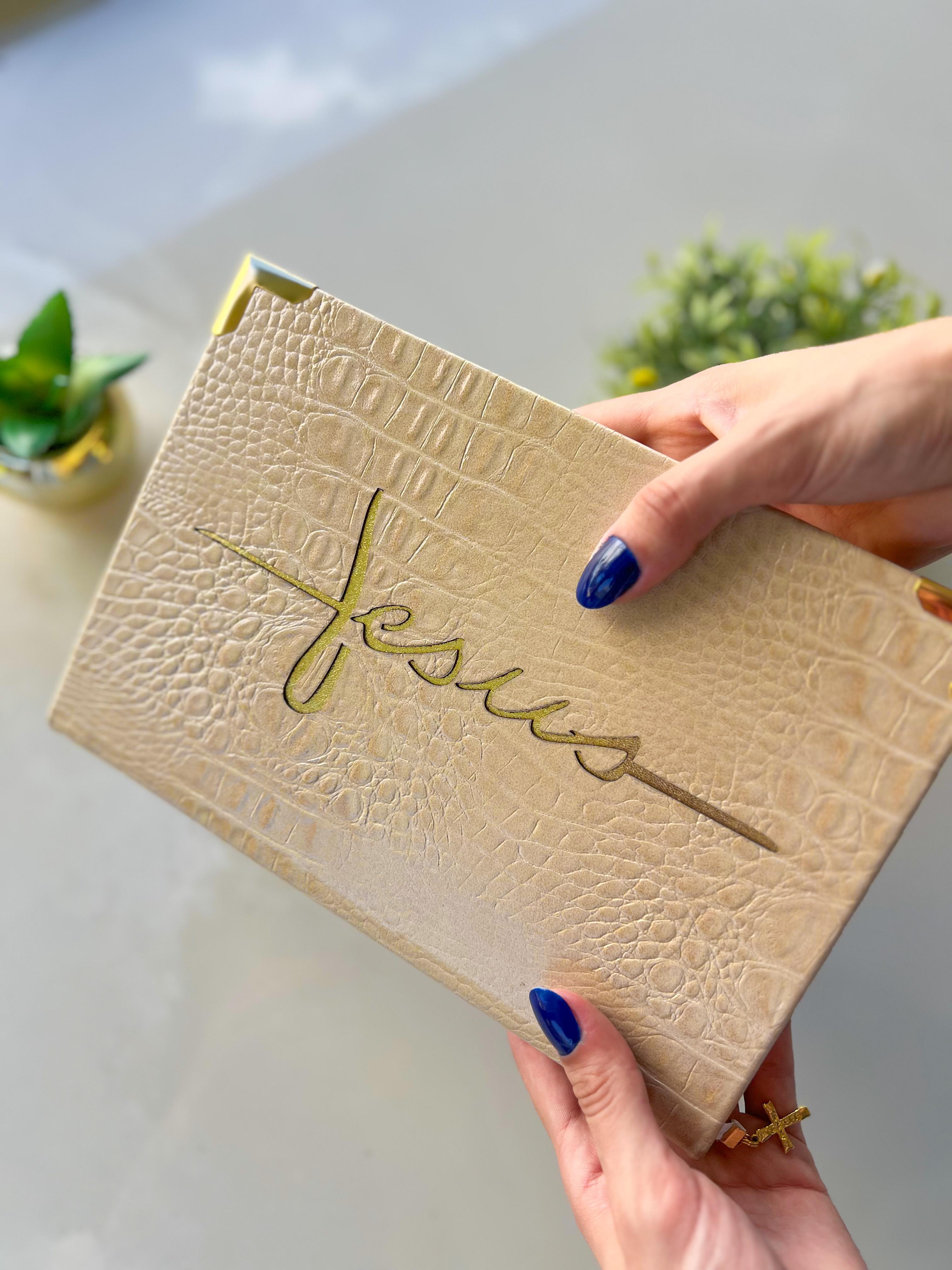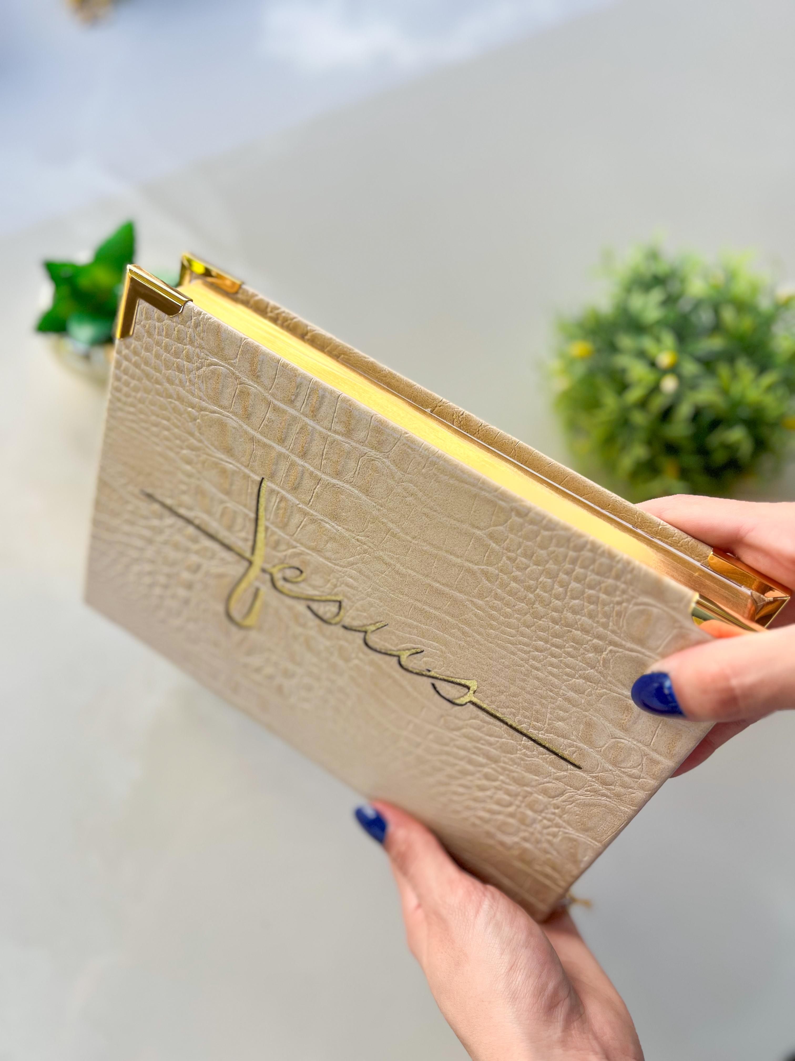 Bíblia Couro Nude com Jesus vazado dourado - Versão NVI - Tamanho GRANDE - Letra ExtraGigante
