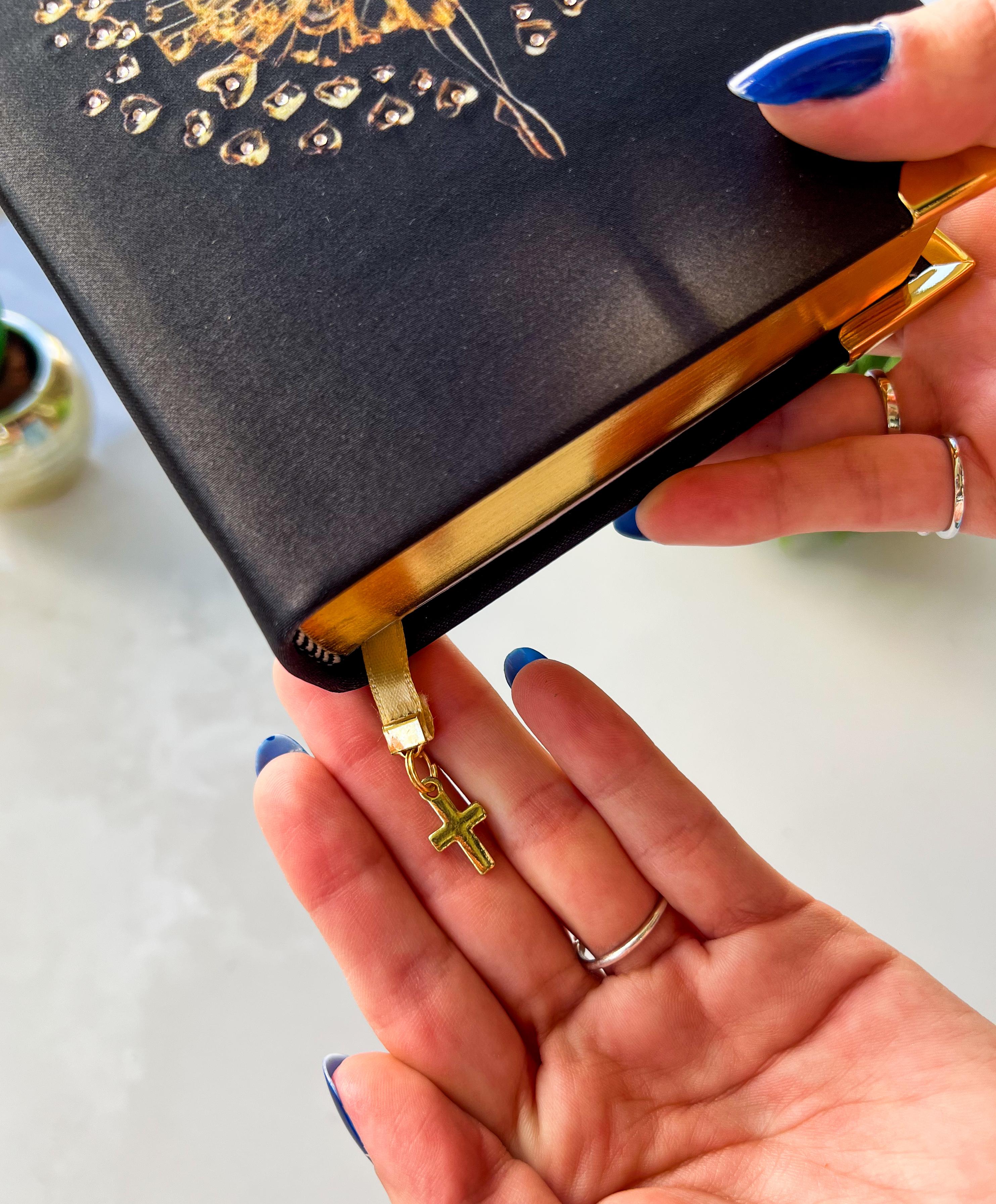 -Cantoneiras e pingente de cruz dourada combinando com a Bíblia.